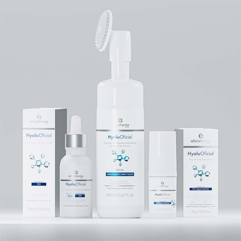 O Kit Completo HyaluOficial combina a ação de limpeza da Espuma Hidratante, o efeito lifting do Sérum Volumizador 12X, o tratamento pontual do Stick de Ácido Hialurônico, e a ação reestruturante profunda do Creme Preenchedor Facial 12X. Juntos, esses quatro produtos formam a solução perfeita para uma pele mais jovem, firme e hidratada.