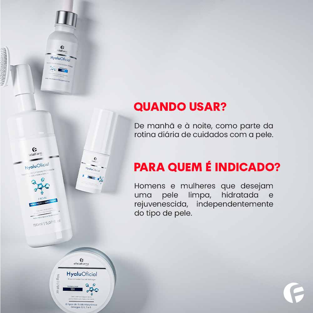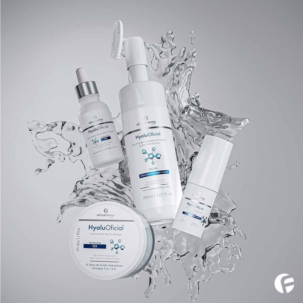 O Kit Completo HyaluOficial – Espuma + Sérum Volumizador 12X + Stick de Ácido Hialurônico + Creme Preenchedor Facial 12X, transforma sua rotina de cuidados com a pele, através da revolucionária tecnologia 12x Aqua Refresh que combina 8 tipos de Ácido Hialurônico em sinergia com 4 tipos de Ômegas e Niacinamida proporcionando a redução das rugas e linhas de expressão, aumentando a firmeza da pele enquanto promove a proteção contra a luz azul.