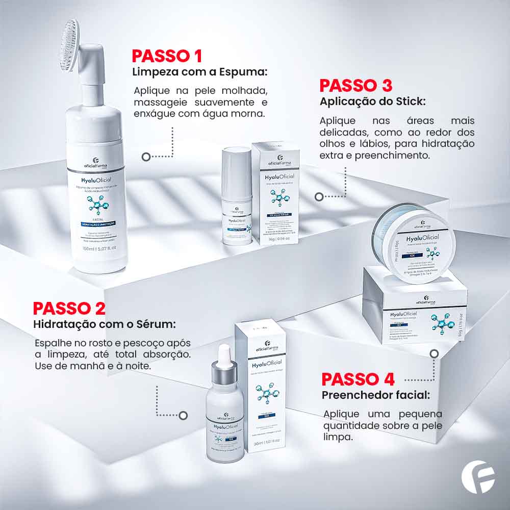 O Kit Completo HyaluOficial combina a ação de limpeza da Espuma Hidratante, o efeito lifting do Sérum Volumizador 12X, o tratamento pontual do Stick de Ácido Hialurônico, e a ação reestruturante profunda do Creme Preenchedor Facial 12X. Juntos, esses quatro produtos formam a solução perfeita para uma pele mais jovem, firme e hidratada.